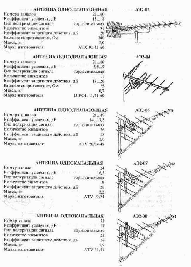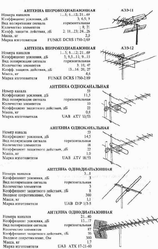 Все перечисленные ниже антенны являются пассивными за исключением антенн типа АЭЗ-07 и 20/6-12/21-60, которые содержат широкодиапазонные антенные усилители. В приводимых данных каждой антенны значение коэффициента усиления дается по отношению к полуволновому вибратору. Коэффициент защитного действия показывает отношение уровней главного лепестка диаграммы направленности антенны к уровню ее заднего лепестка. Большей частью указаны две марки каждой антенны: по номенклатуре корпорации "Белка" и по номенклатуре изготовителя (например: АЭ1-01 и DIPOL 5/3-5).